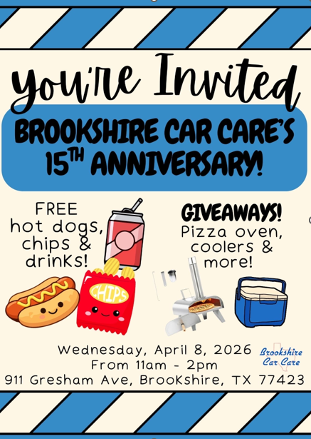 Save the date! April 8th 11:00 a.m. - 2:00 p.m. Brookshire Car Care Celebrating their 15th Anniversary! 911 Gresham Ave. Brookshire, TX FREE Hot Dogs, Chips and Drinks GIVEAWAYS: Pizza Oven, Coolers & Much More!