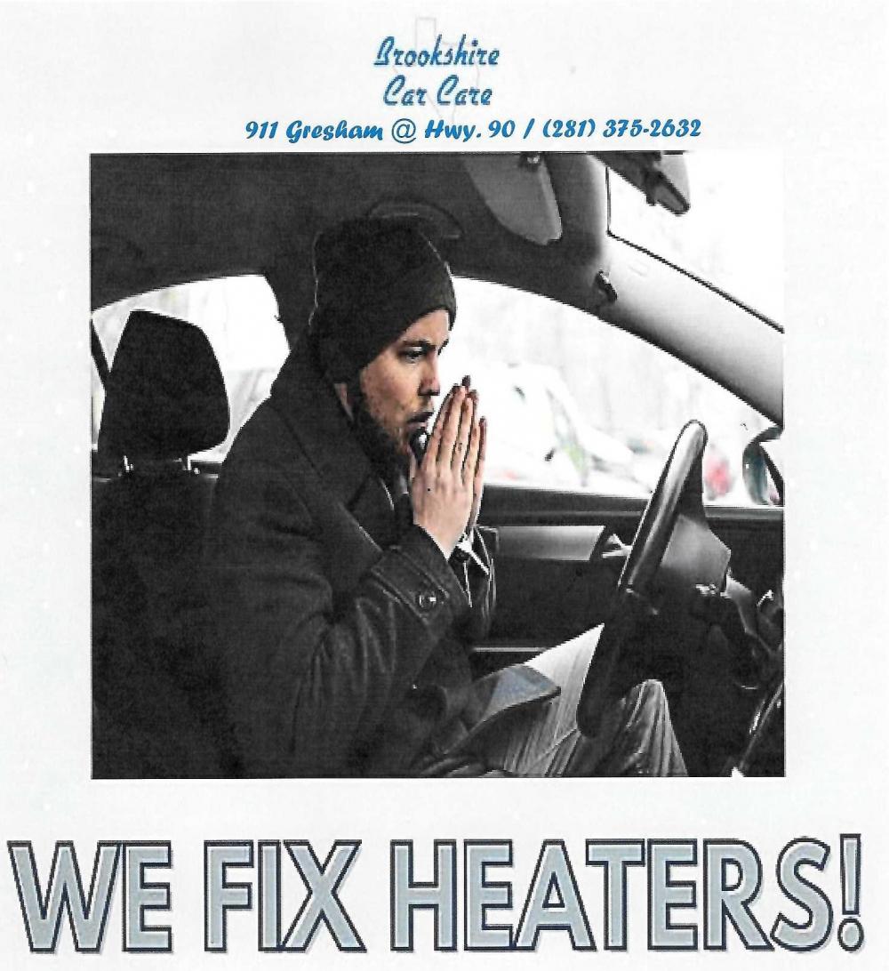 Brookshire Car Care 911 Gresham @ Hwy 90 281-375-2632 They have highly trained technicians that can get your heater blowing hot again in no time. Stop by and stay warm this winter!