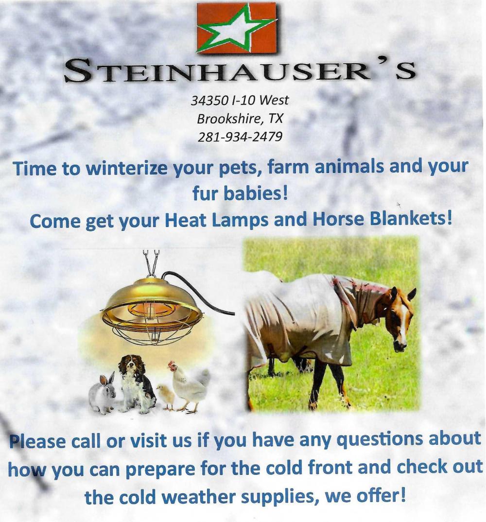 If you have any questions about how to prepare for the cold front give them a call. They will be happy to help you out with cold weather supplies. Such as heat lamps, horse blankets and much more!
